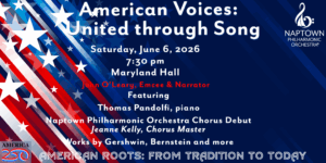 On Saturday evening, June 6, the final performance of the season, American Voices: United Through Song, will feature renown pianist Thomas Pandolfi and the inaugural performance of the Naptown Philharmonic Orchestra Chorus, directed by Jeanne Kelly, performing with the orchestra to showcase American music and celebrate America’s 250th birthday.