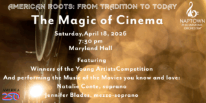 The favorite music of the movies will be front and center for our Magic of Cinema concert on Saturday evening, April 18, at Maryland Hall, featuring favorite music of the movies. And this evening’s concert will highlight winners of the Naptown Philharmonic Orchestra’s Young Artists Concerto Competition. The competition is open to all Maryland high school musicians.