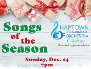 On Sunday, December 14, our Naptown Philharmonic Orchestra Chorus will present its debut concert, “Sounds of the Season” at Eastport United Methodist Church, 926 Bay Ridge Avenue, at 3pm. It will be a joyous celebration of this happy time of year! Stay tuned for more information.
